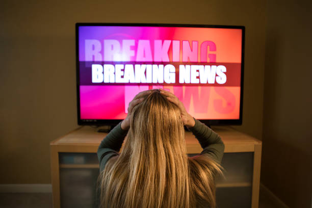 A woman with her head in her hands, stressed as she watches breaking news on her television.